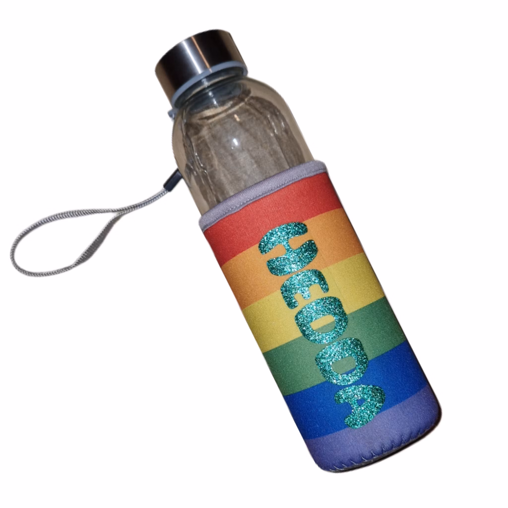 Glassflaske med beholder i neopren. Beholderen kan oppbevares i kjøleskap eller legges i frys for å bli ekstra kald og holde drikken kaldere.